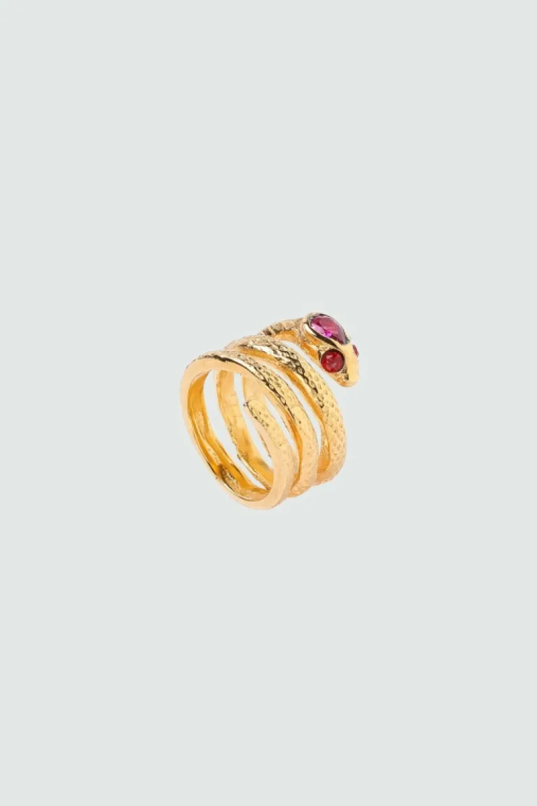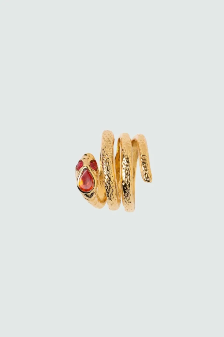 Anello serpente, da indossare al dito indice, realizzato artigianalmente a Firenze dalla designer di gioielli Bona Tondinelli. Presenta una silhouette con serpente intrecciato, in ottone placcato oro, impreziosito da cristalli rossi. Ogni irregolarità è un dettaglio prezioso, che rende questo gioiello speciale ed unico. Made in Italy.