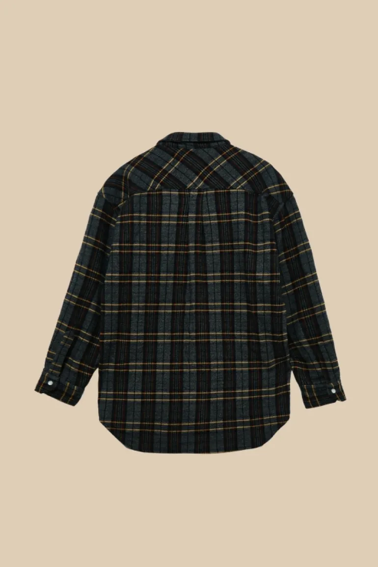 Camicia di manifattura italiana in misto lana check. Colletto classico. Chiusura con bottoni a pressione. Maniche lunghe e polsini con bottoni. Due tasche piatte sul petto con patta e bottone a pressione. Patch Roy Roger’s applicato su una tasca. Oversize fit. COMPOSIZIONE: 75% LANA 25% NYLON.