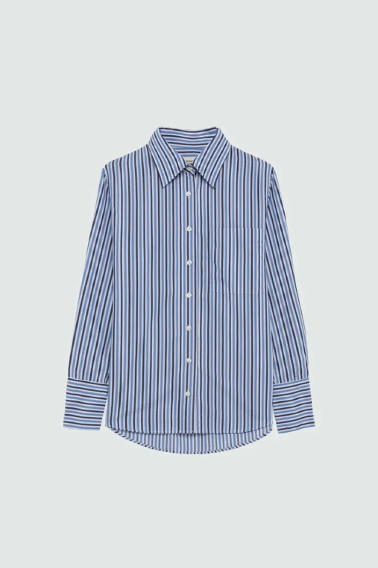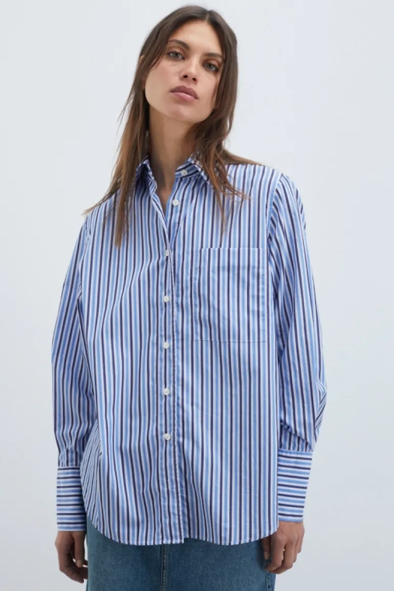Camicia Mimi in popeline di cotone washed stripe. Colletto classico. Chiusura con bottoni logati. Tasca piatta sul petto. Cannone sul retro e label Roy Roger’s applicata sul retro. Fondo stondato. Relaxed fit. COMPOSIZIONE: 100% COTONE.