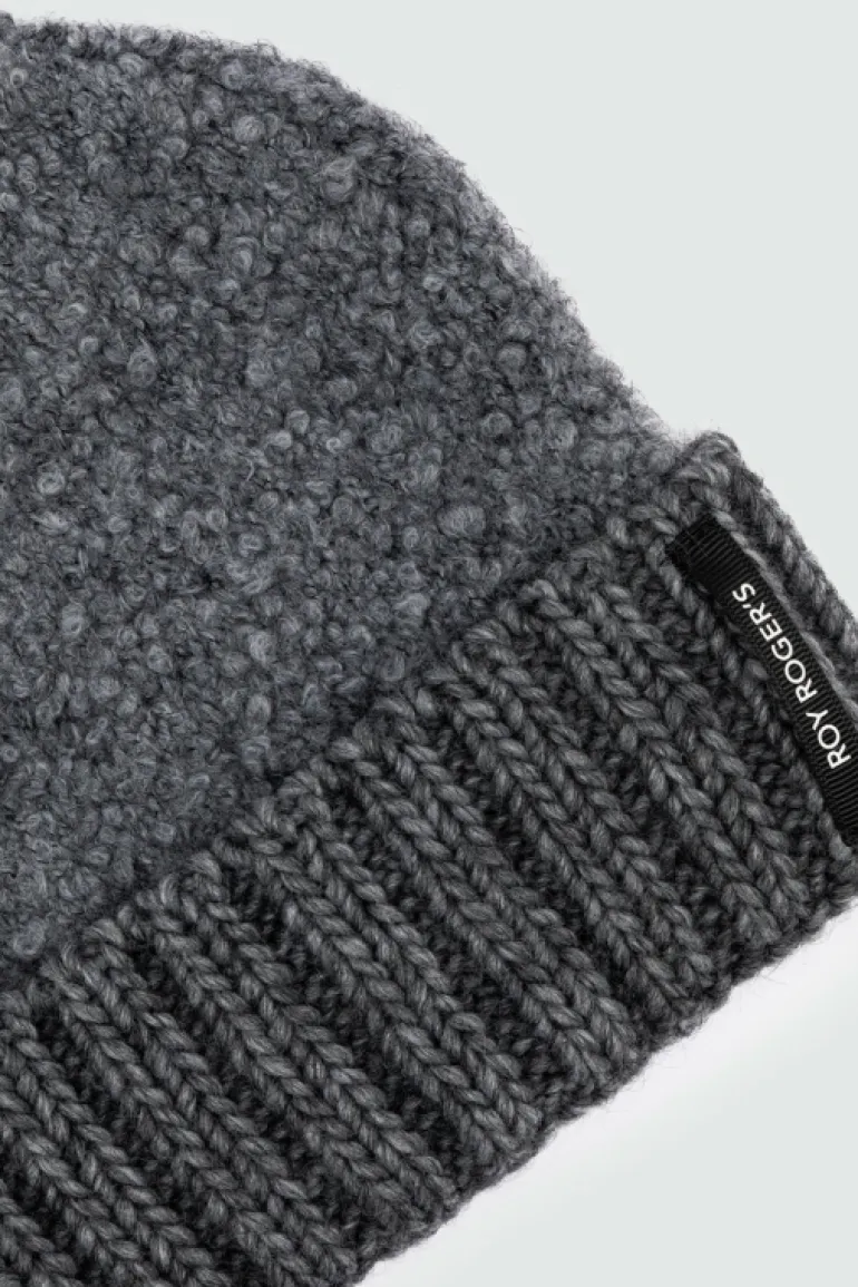 Cappello Beanie in lana bouclè tinta unita. Fondo con maxi reverse a coste e label Roy Roger’s applicata. COMPOSIZIONE: 50% ACRILICO 22% MOHAIR 16% POLIAMMIDE 10% LANA 2% ELASTAN.