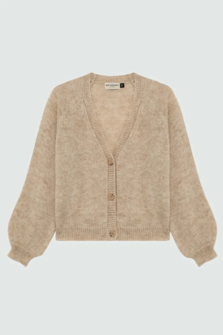 Cardigan in misto mohair tinta unita. Collo a V. Chiusura con bottoni aspetto corno. Profili a coste. Label Roy Roger’s applicata sul retro. Relaxed fit. COMPOSIZIONE: 30% MOHAIR 40% ACRILICO 30% POLIAMMIDE.