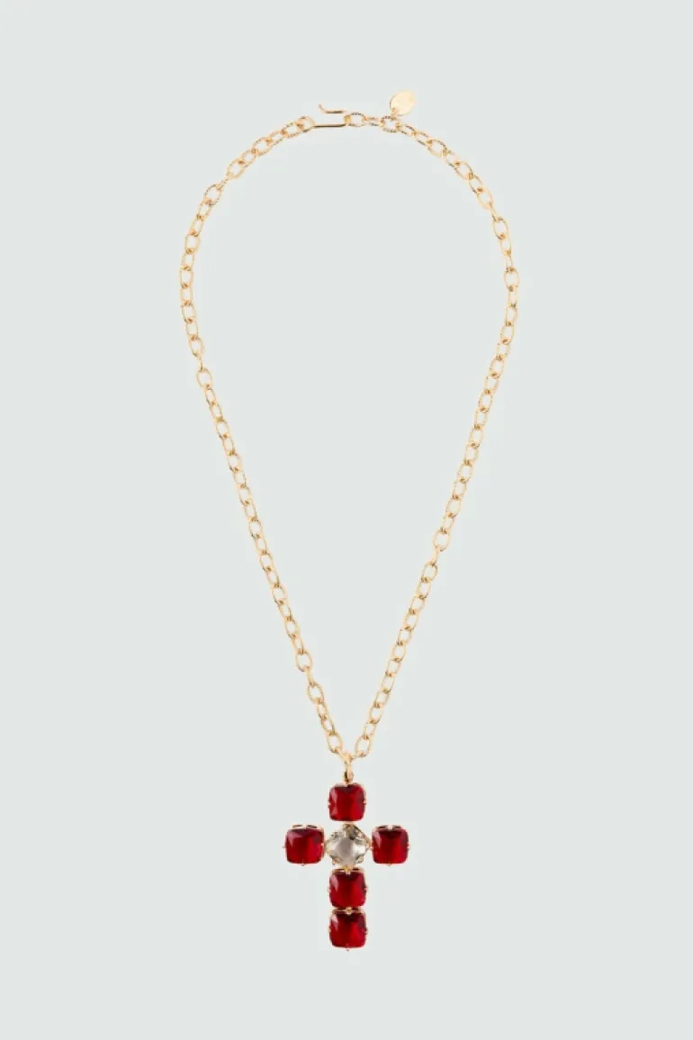 Collana croce, realizzata artigianalmente a Firenze dalla designer di gioielli Bona Tondinelli. Collana catenella, con croce pendente in ottone placcato oro, arricchita da macro cristalli rossi per un gusto classico ma eccentrico. Chiusura con piccolo gancio ad U in tono. Ogni irregolarità è un dettaglio prezioso, che rende questo gioiello speciale ed unico. Made in Italy.