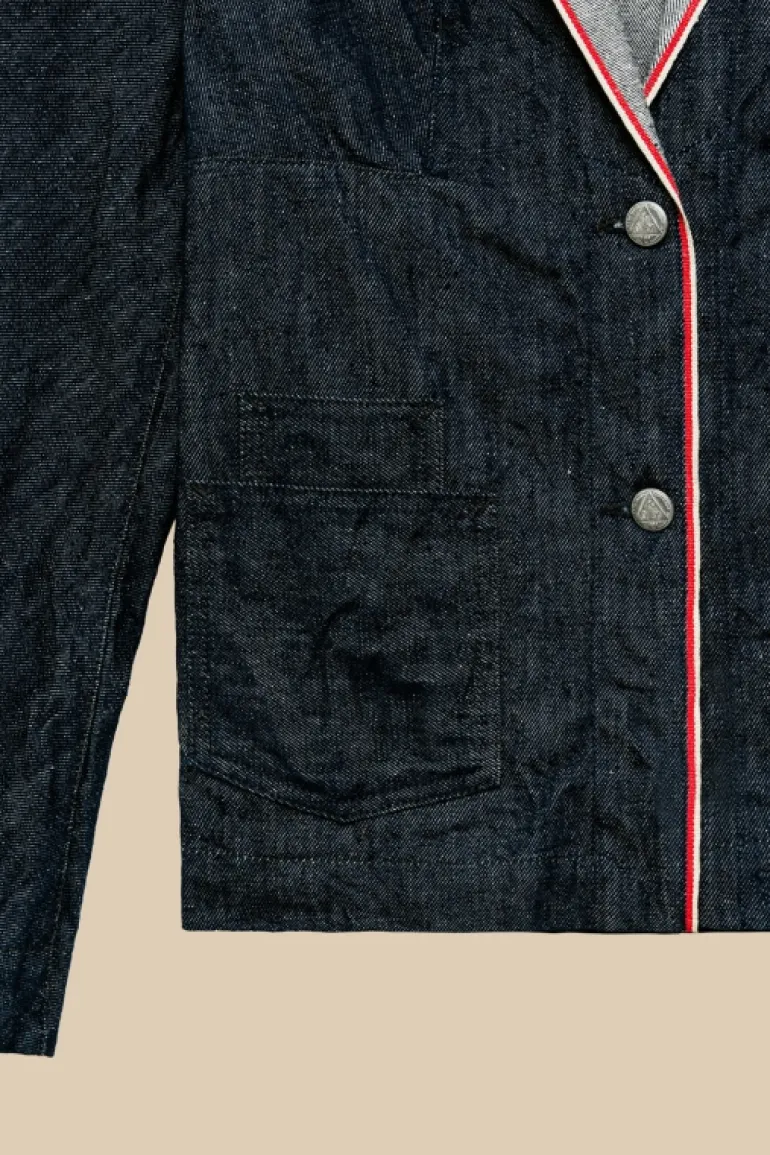 Giacca monopetto destrutturata con cimosa a vista, ripresa da un modello donna di archivio che reinterpretava un capo classico come il blazer visto dagli occhi di un’azienda denim come Roy Roger’s.