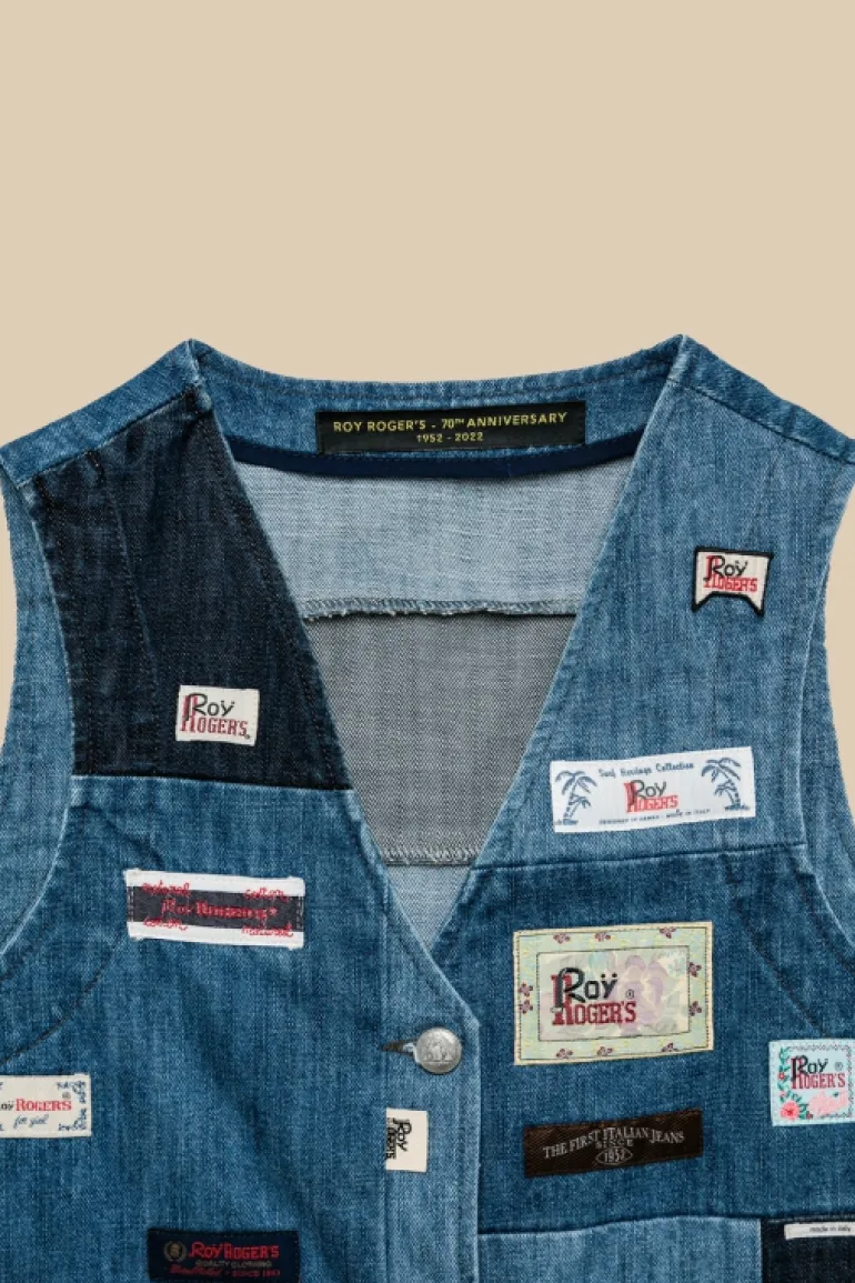 Questo Gilet è interamente realizzato grazie all’unione di patch in denim che nella loro diversità rappresentano la varietà delle sfumature di questo tessuto. Questo capo è arricchito da una grande varietà di etichette originali in tessuto di Roy Roger’s realizzate nei 70 anni di attività. Attraverso questo capo si raccontano quasi 70 anni di storia.
