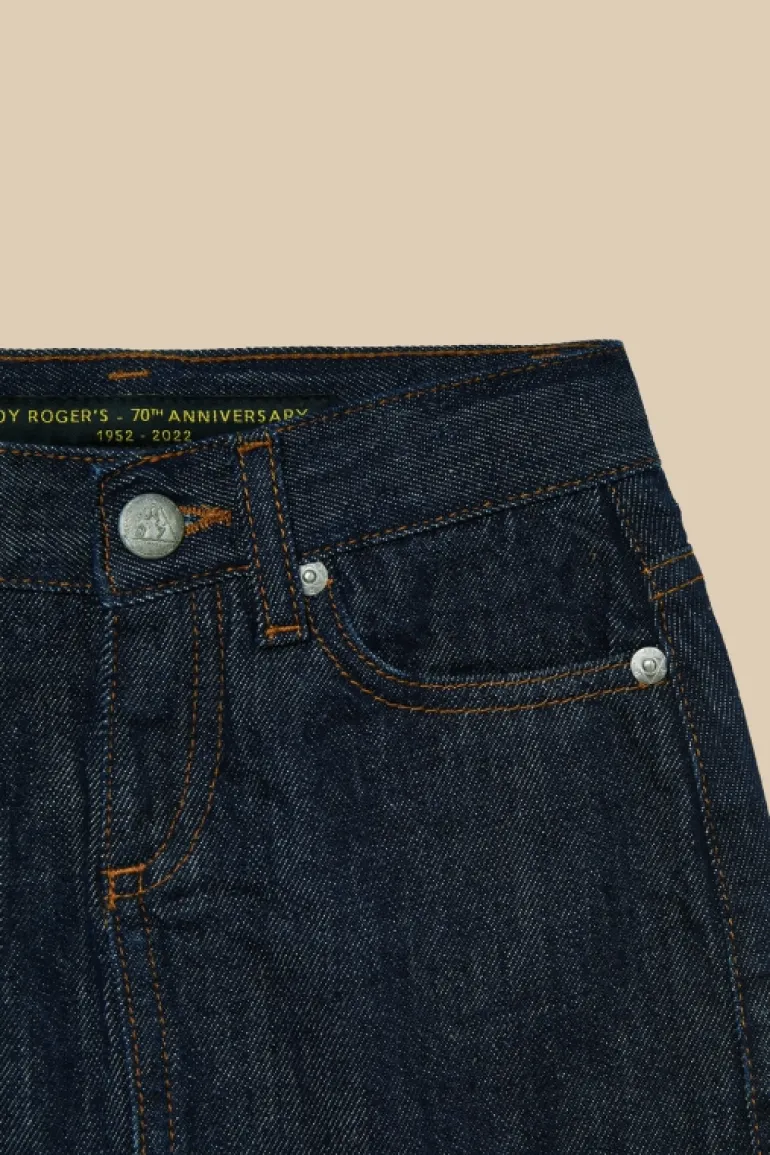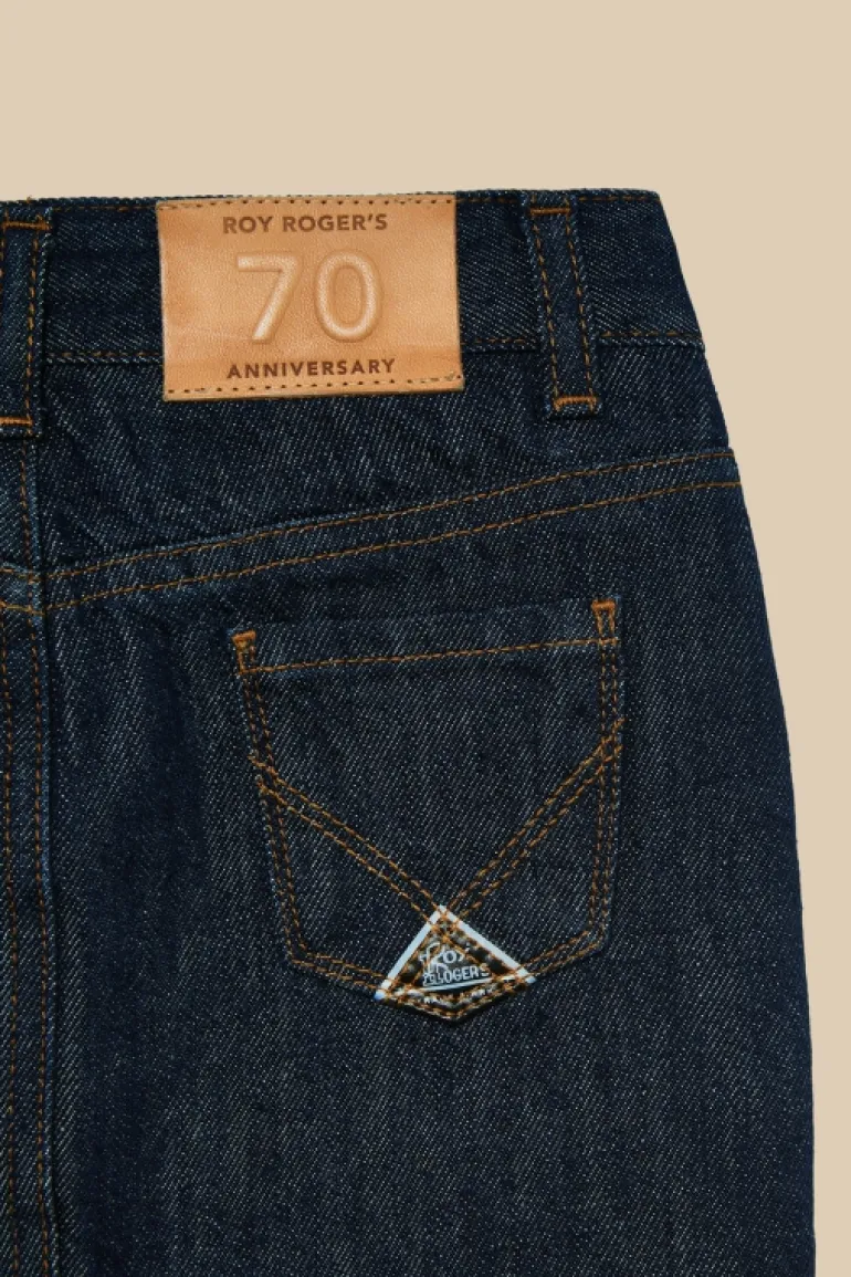 Gonna di manifattura italiana in denim con lavaggio scuro. Vita media con passanti e salpa Roy Roger’s 70 Anniversary applicata sul retro. Chiusura sul fronte con bottone logato e zip. Due tasche sul fronte e due tasche sul retro con label Roy Roger’s Anniversary applicato. Regular fit. COMPOSIZIONE: 100% COTONE.