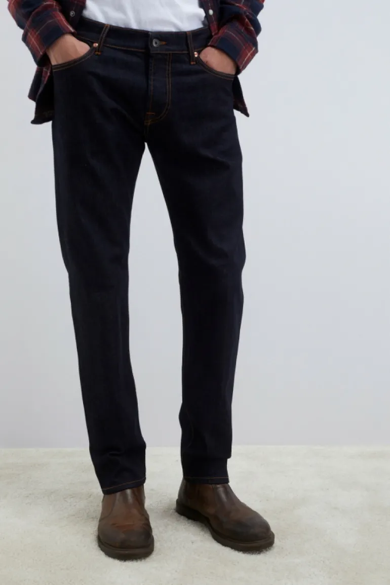 Jeans in denim con lavaggio scuro e impunture in contrasto. Vita media con passanti e salpa applicata sul retro. Chiusura con bottone logato e zip. Due tasche sul fronte e due tasche sul retro con label Roy Roger’s applicata. Slim fit. COMPOSIZIONE: 98% COTONE 2% ELASTODIENE.