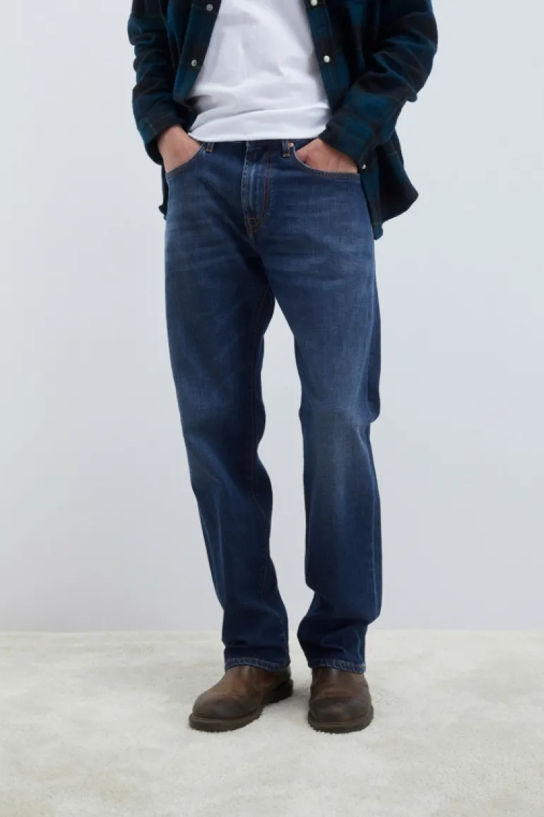 Jeans in denim Royal con lavaggio scuro e impunture in contrasto. Vita media con passanti e salpa applicata sul retro. Chiusura con bottone logato e zip. Due tasche sul fronte e due tasche sul retro con label Roy Roger’s applicata. Regular fit. COMPOSIZIONE: 99% COTONE 1% ELASTAN.