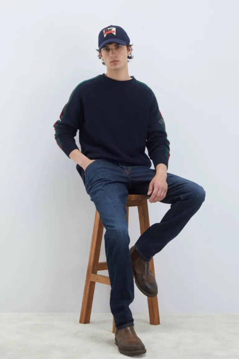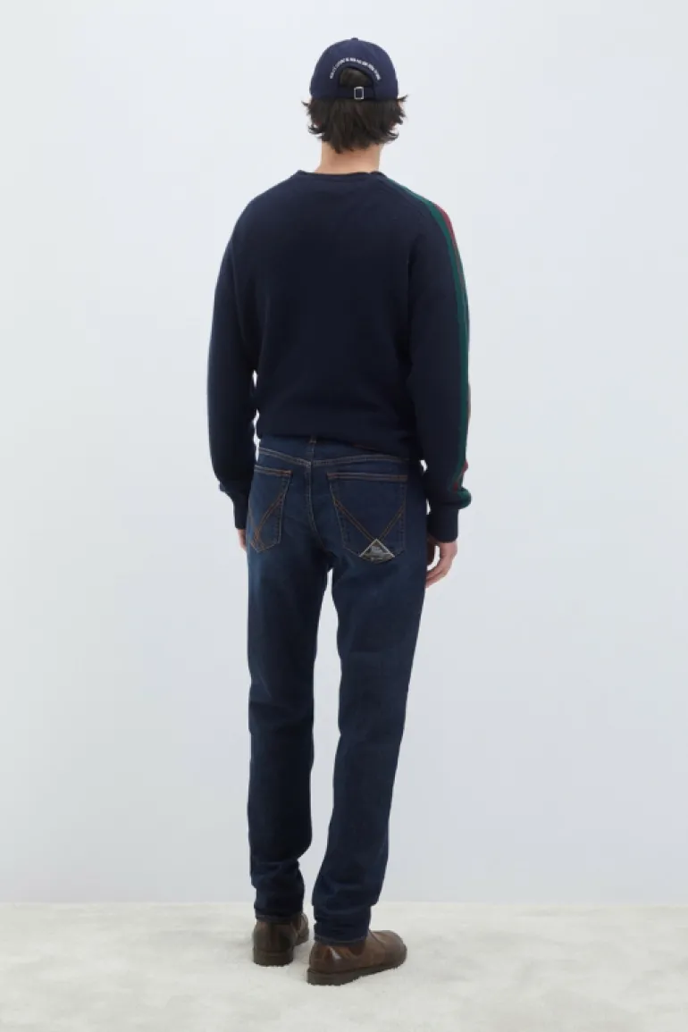 Jeans in denim con lavaggio scuro e impunture in contrasto. Vita media con passanti e salpa applicata sul retro. Chiusura con bottoni logati. Due tasche sul fronte e due tasche sul retro con label Roy Roger’s applicata. Slim fit. COMPOSIZIONE: 98% COTONE 2% ELASTAN.