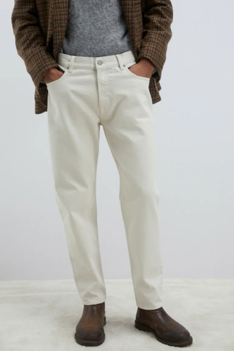 Jeans research in denim bull effetto naturale e leggero effetto used. Vita media con passanti e salpa applicata sul retro. Chiusura con bottone logato e zip. Due tasche sul fronte e due tasche sul retro con label Roy Roger’s applicata. Carrot fit. COMPOSIZIONE: 100% COTONE.