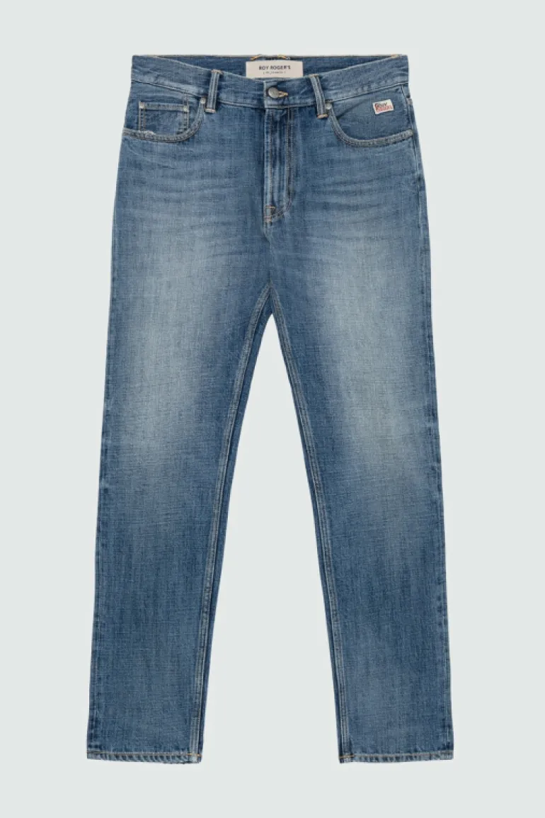Jeans in denim Royal research con lavaggio medio e leggero effetto washed. Vita media con passanti e salpa applicata sul retro. Chiusura con bottone logato e zip. Due tasche sul fronte e due tasche sul retro con label Roy Roger’s applicata. Carrot fit. COMPOSIZIONE: 100% COTONE.