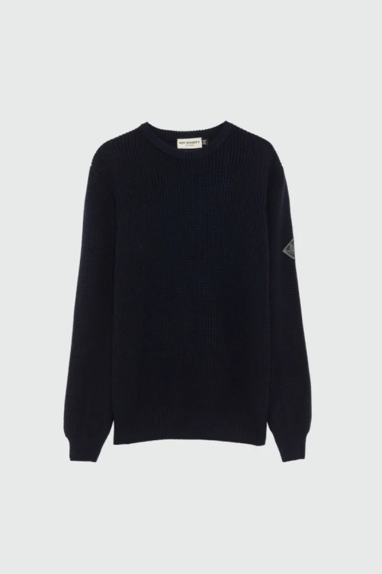 Maglia girocollo in lana punto inglese tinta unita. Maniche lunghe. Collo, polsini e fondo a costine. Patch Roy Roger’s in denim applicata su una manica. Regular fit. COMPOSIZIONE: 100% LANA.